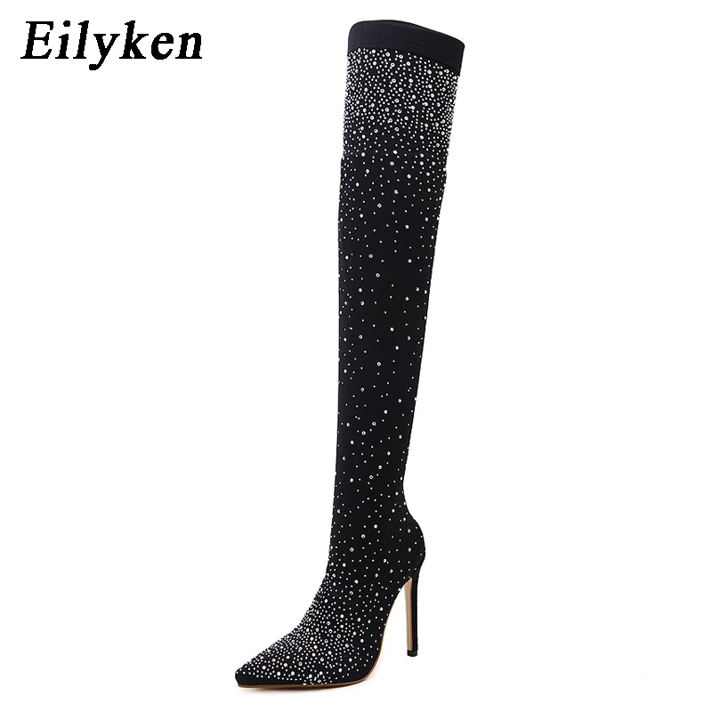 New Eilyken 2020 Fashion Runway Crystal Stretch Fabric Sock Boots Pointy Toe Over-the-Knee Heel Thigh H