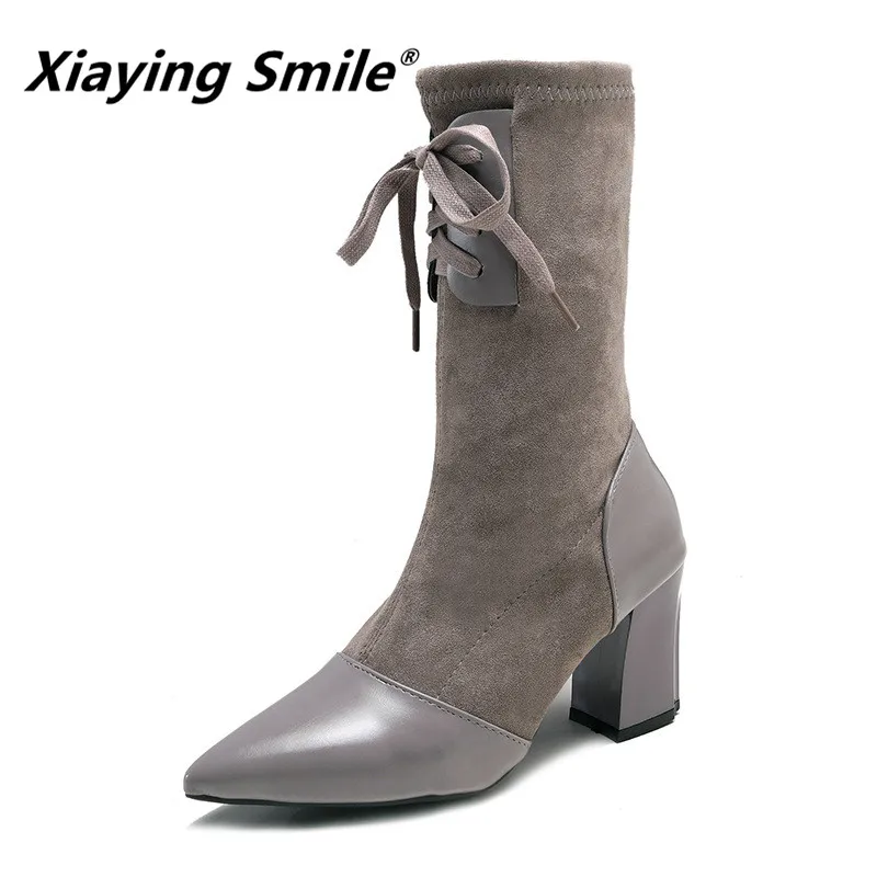 Best Xiaying Smile Winter Women Mid-Calf Boots New Style Pointed Toe Solid Shoes Laies Fahsion Casual La