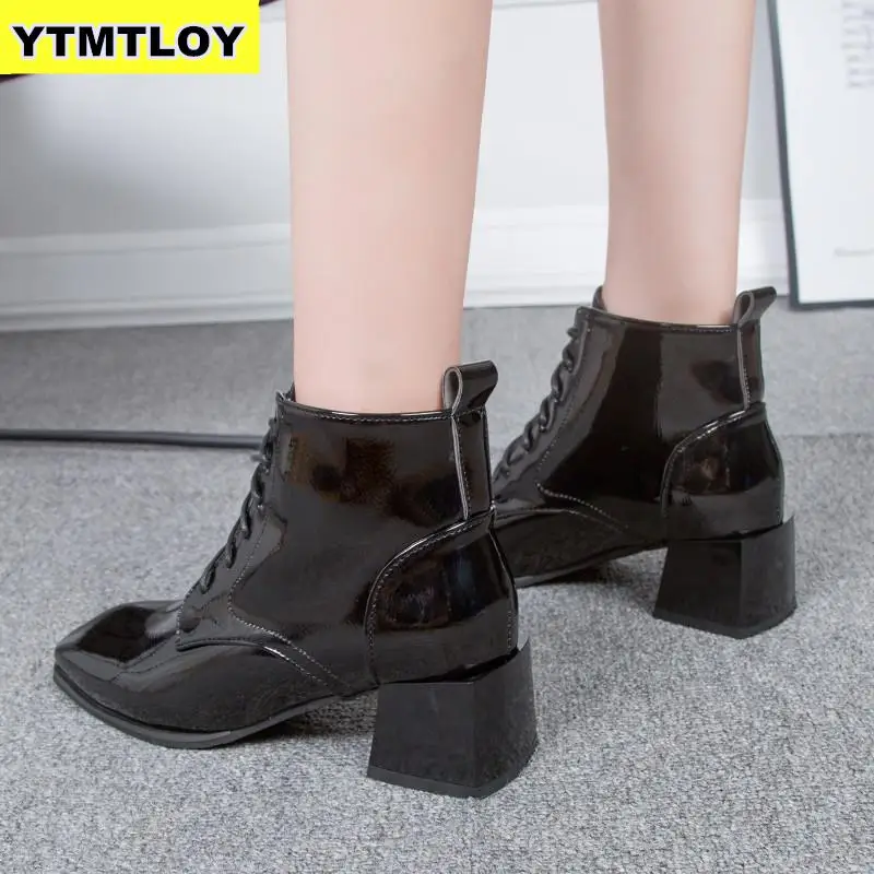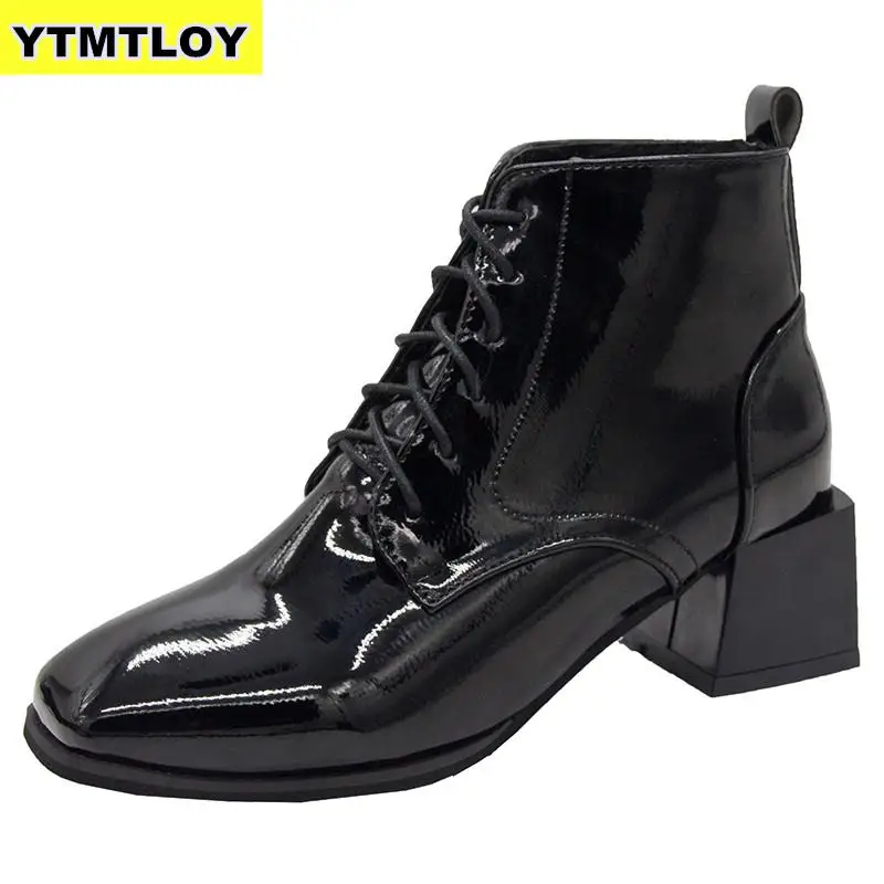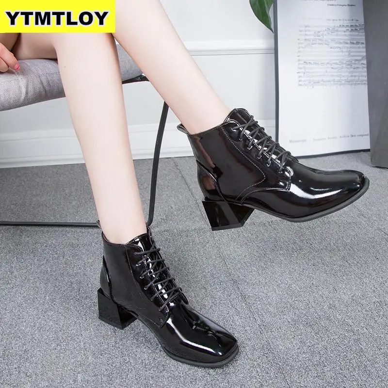 Best 2019 Fashion Pantent Leather Ankle Boots Women Thick High Heels Zipper Boots Pointed Toe Autumn Win