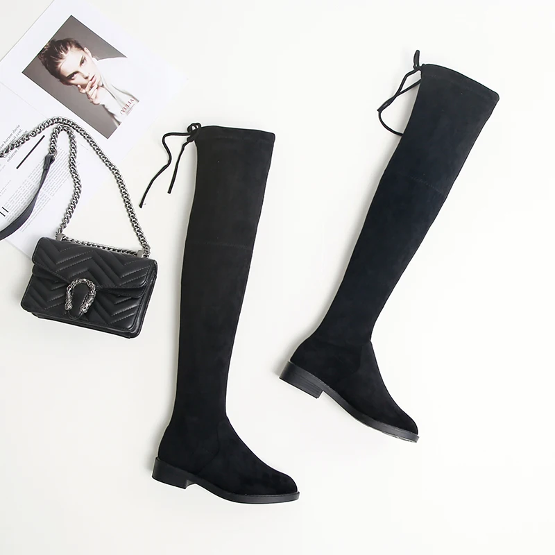 New KATELVADI Size 34-43 Over Knee Boots Women Round Toe Square Low Heels Black Flock Women Thigh High